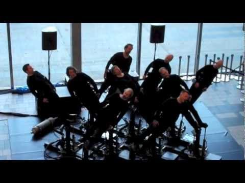 Es una escultura viviente, una performance sonora y sobretodo una obra realmente atípica. Pendulum Choir es lo más parecido a una máquina musical orgánica de grandes dimensiones, formada por nueve voces a capella y 18 gatos ... y, aunque pueda parecer extraño hablando de un festival donde a menudo las nuevas tecnologías se mezclan con la vida real, esta vez no estamos hablando de felinos. Los 18 gatos del título son máquinas hidráulicas que controlan los movimientos, la distribución espacial y las sonoridades de esta extraña escultura orgánica, formada únicamente por cuerpos humanos.